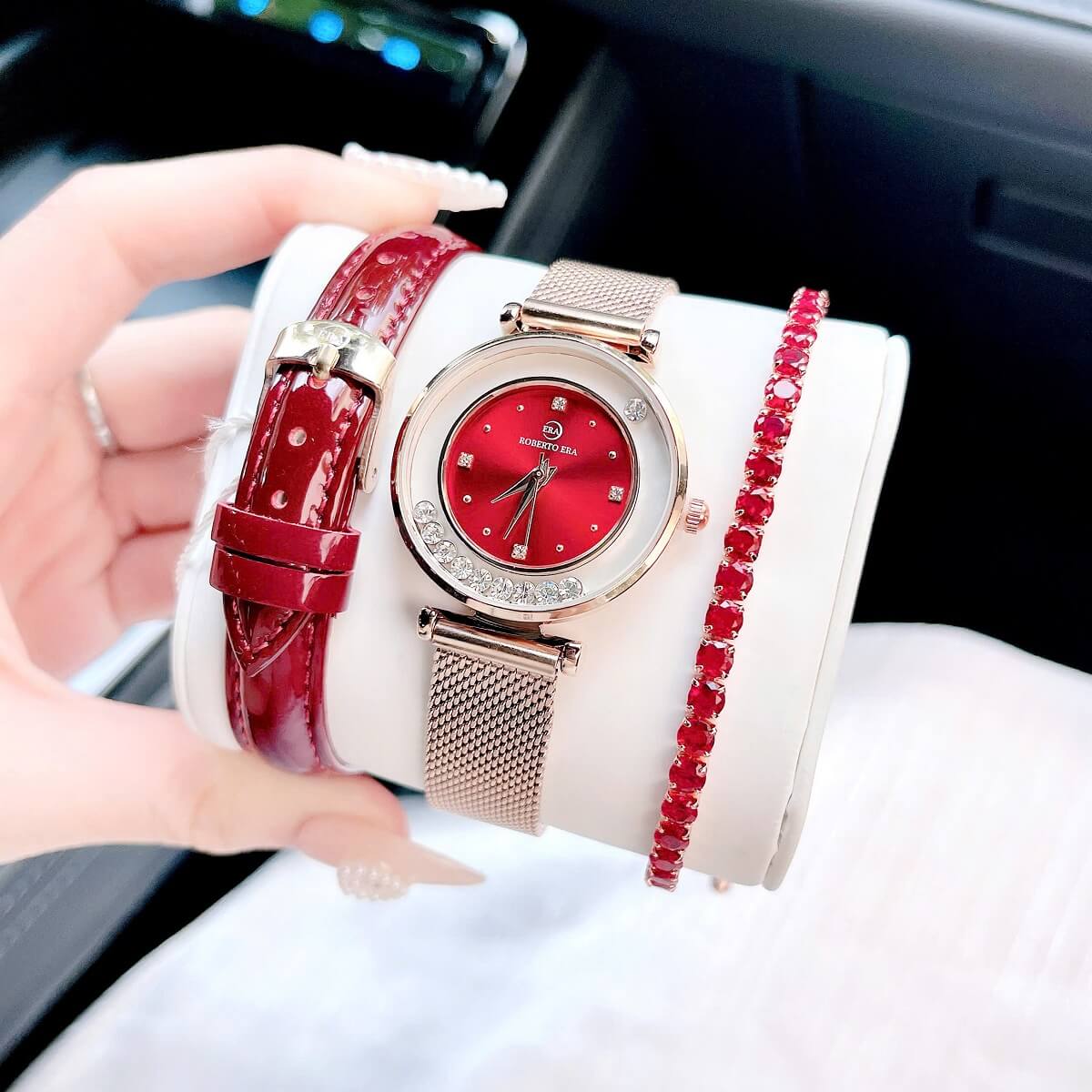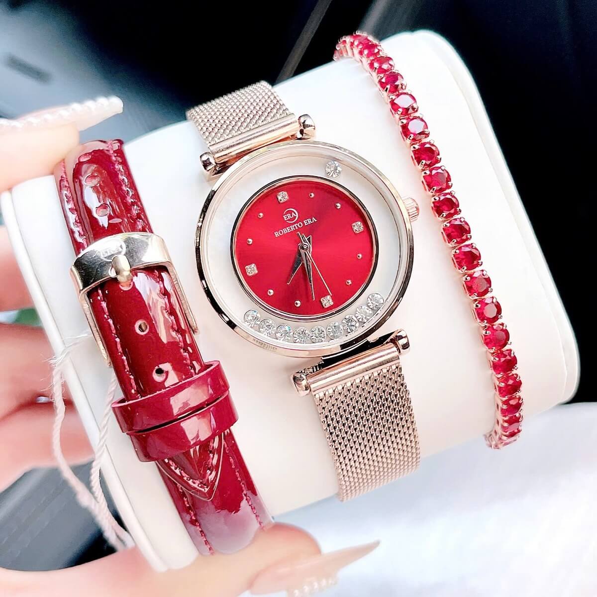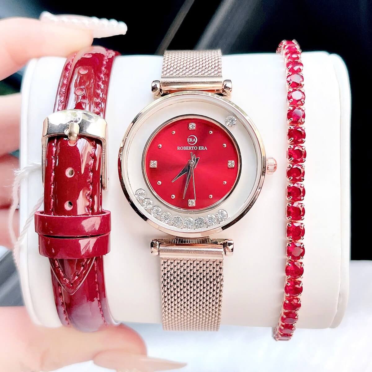 Thông số chi tiết sản phẩm: Set Đồng Hồ Nữ Roberto Era Dây Da Đỏ Vỏ Rose Size 32mm Chính Hãng