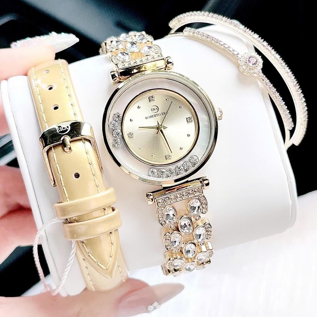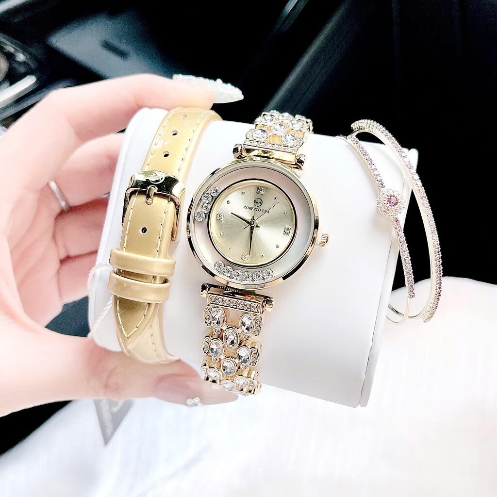 Nhanh tay sở hữu Set Đồng Hồ Nữ Roberto Era Dây Da Vàng Vỏ Vàng Đá Chảy Size 32mm với mức giá ưu đãi và nhiều khuyến mãi hấp dẫn trong tháng này!