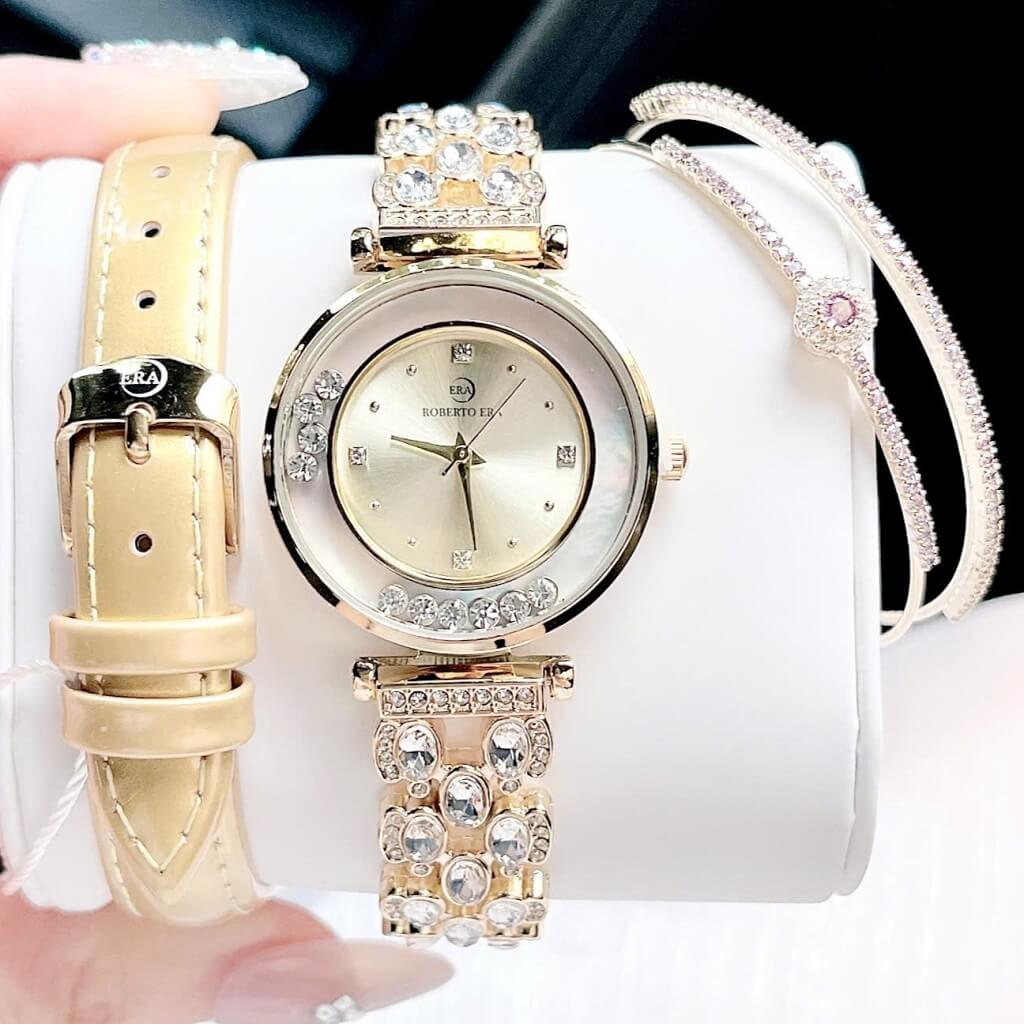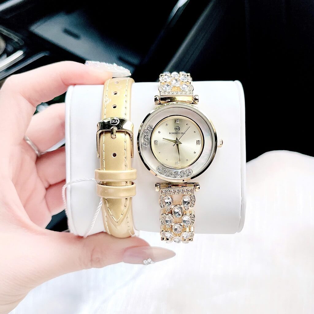 Hãy để Set Đồng Hồ Nữ Roberto Era Dây Da Vàng Vỏ Vàng Đá Chảy Size 32mm giúp bạn khẳng định đẳng cấp và gu thẩm mỹ tinh tế.
