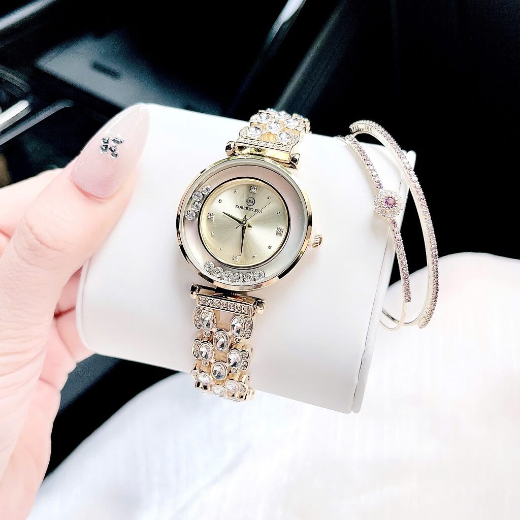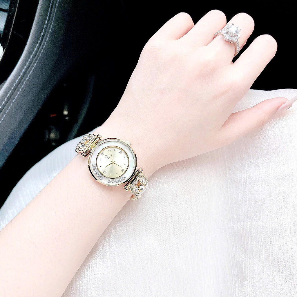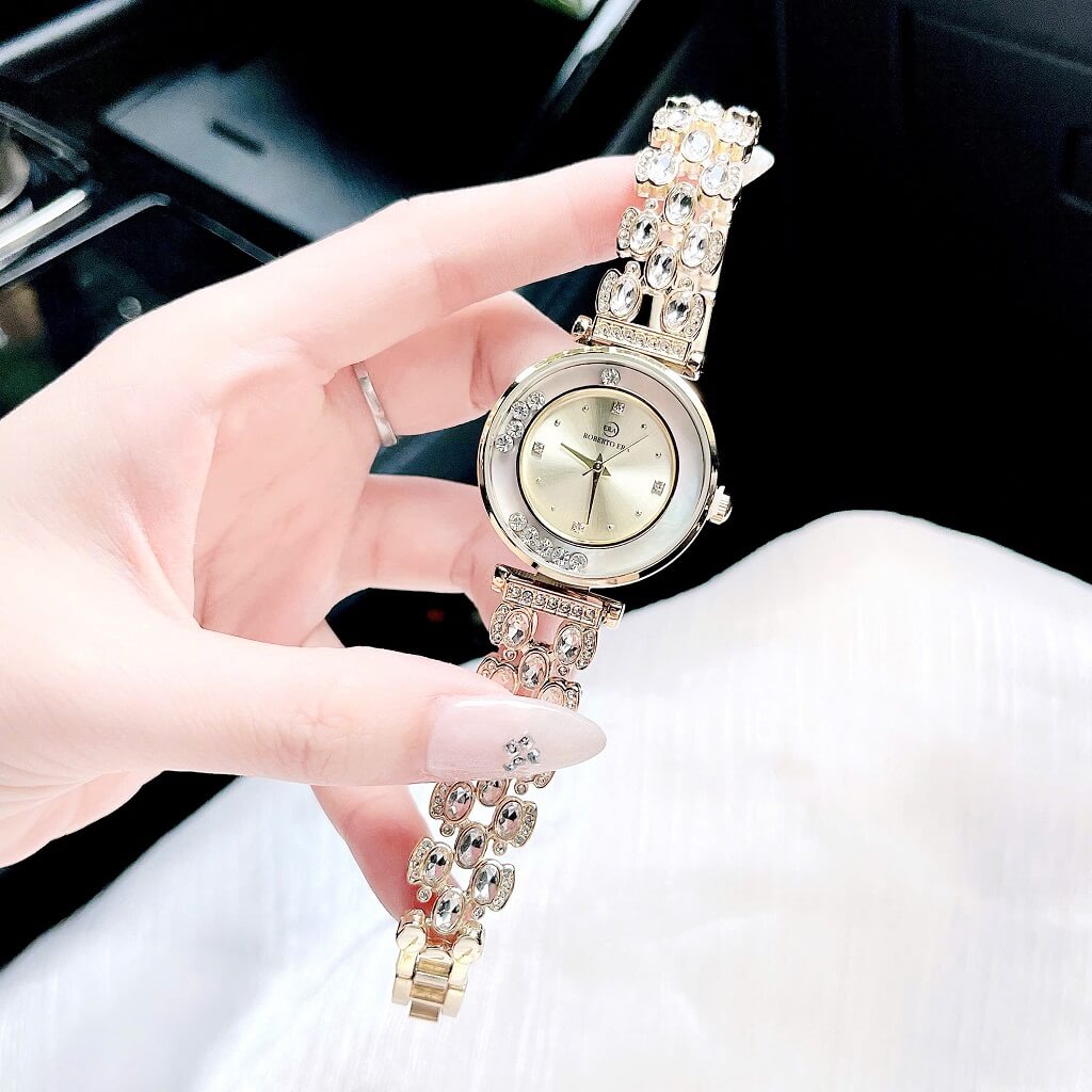 Mặt đồng hồ được đính đá chảy xung quanh viền, tạo hiệu ứng lấp lánh nhẹ nhàng dưới ánh sáng. Mỗi chuyển động của tay bạn đều tỏa sáng thu hút, cực kỳ thích hợp cho các buổi tiệc, đi làm hay hẹn hò.