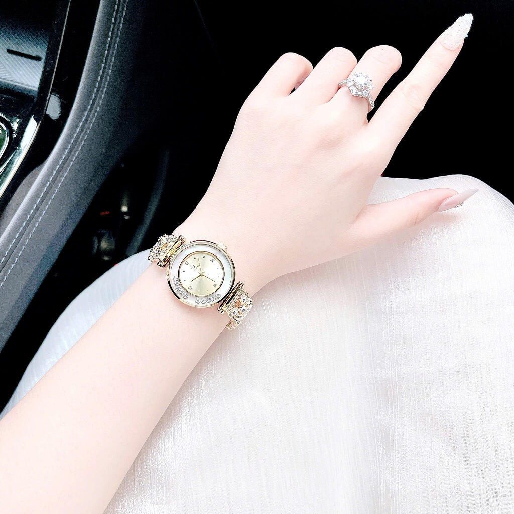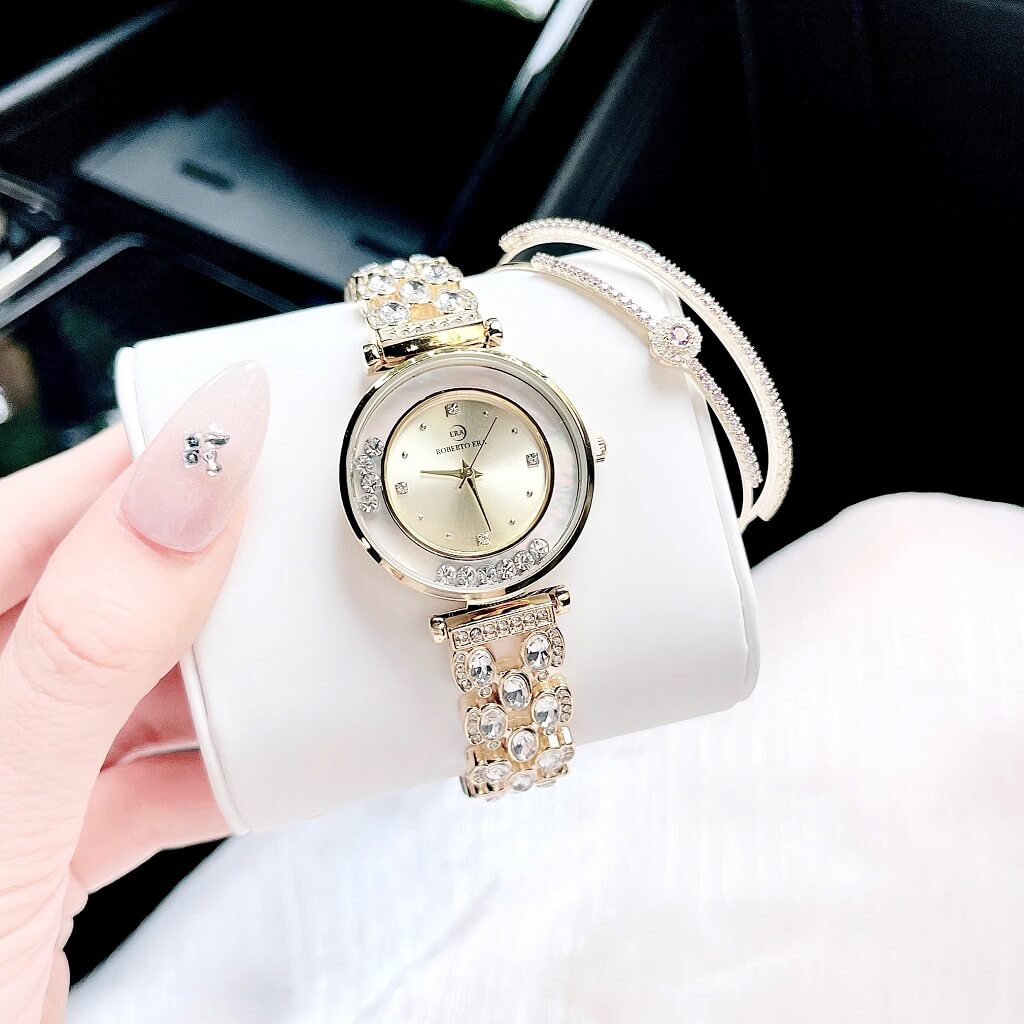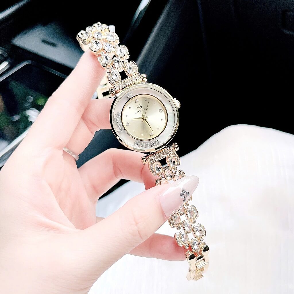 Mặt đồng hồ được đính đá chảy xung quanh viền, tạo hiệu ứng lấp lánh nhẹ nhàng dưới ánh sáng. Mỗi chuyển động của tay bạn đều tỏa sáng thu hút, cực kỳ thích hợp cho các buổi tiệc, đi làm hay hẹn hò.