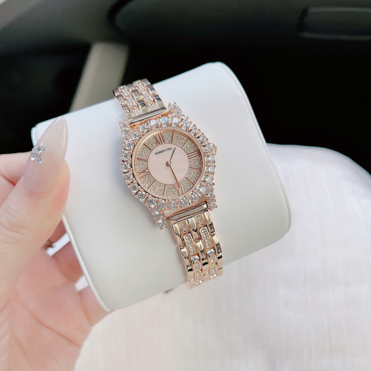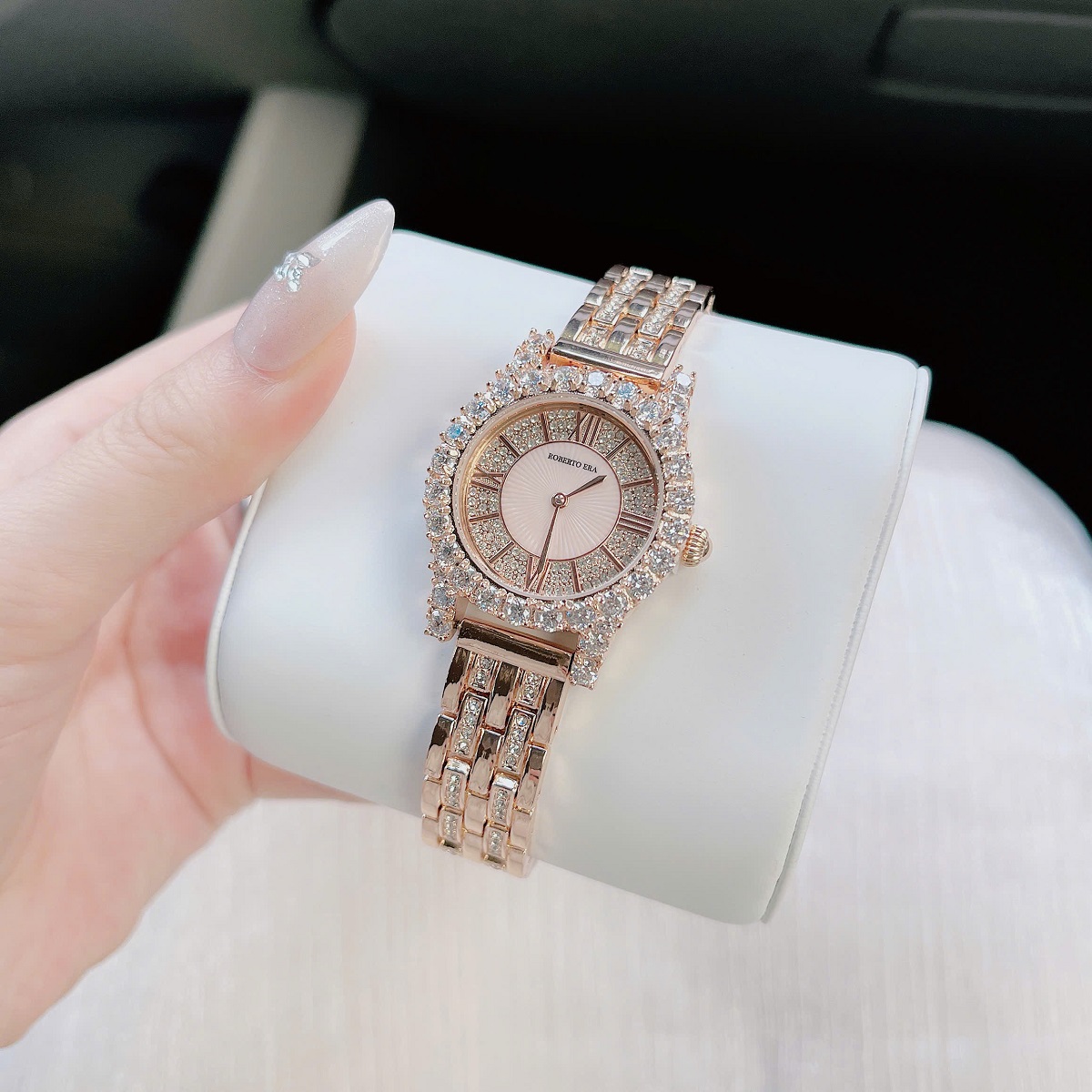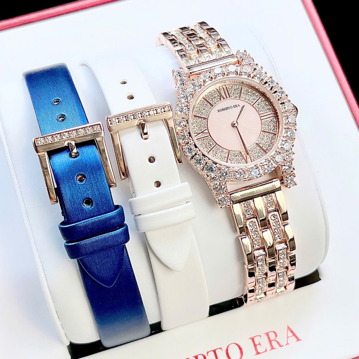 Set Đồng Hồ Nữ Roberto Era là sự kết hợp hoàn hảo giữa thiết kế sang trọng và chất liệu cao cấp. Dây da xanh trắng tinh tế, vỏ vàng hồng sáng bóng và mặt đồng hồ đính đá Swarovski, mang đến vẻ đẹp quý phái cho bất kỳ quý cô nào. Với kích thước 31mm, chiếc đồng hồ vừa vặn, dễ dàng đeo trong mọi hoàn cảnh, từ công sở đến tiệc tùng.